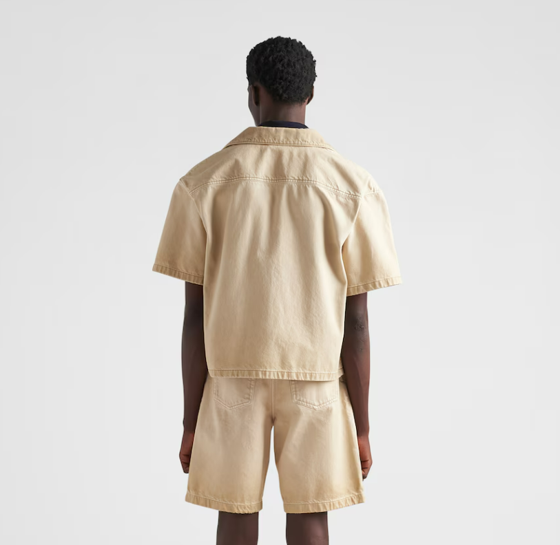박시한 핏과 쇼트 슬리브 디자인으로 여유롭고 경쾌한 스타일을 완성한 이 셔츠는 대비되는 컬러의 스티칭으로 포인트를 주었습니다. 특히 쇼트 슬리브와 전면 패치 포켓 디테일이 돋보여 캐주얼하면서도 세련된 느낌을 자아냅니다. 여기에 프라다의 아이코닉한 에나멜 메탈 트라이앵글 로고로 포인트를 더해 럭셔리한 분위기까지 살렸네요.