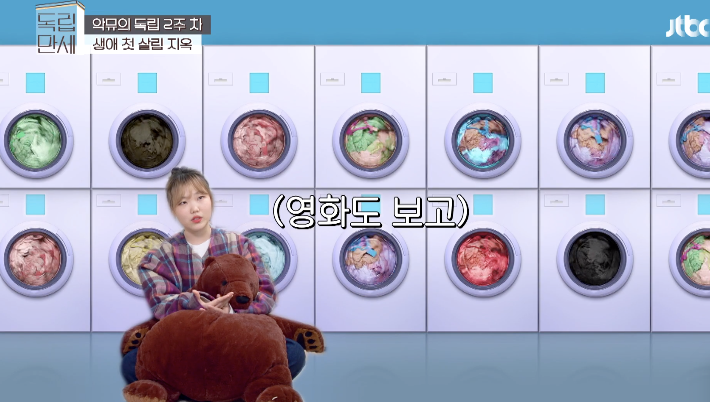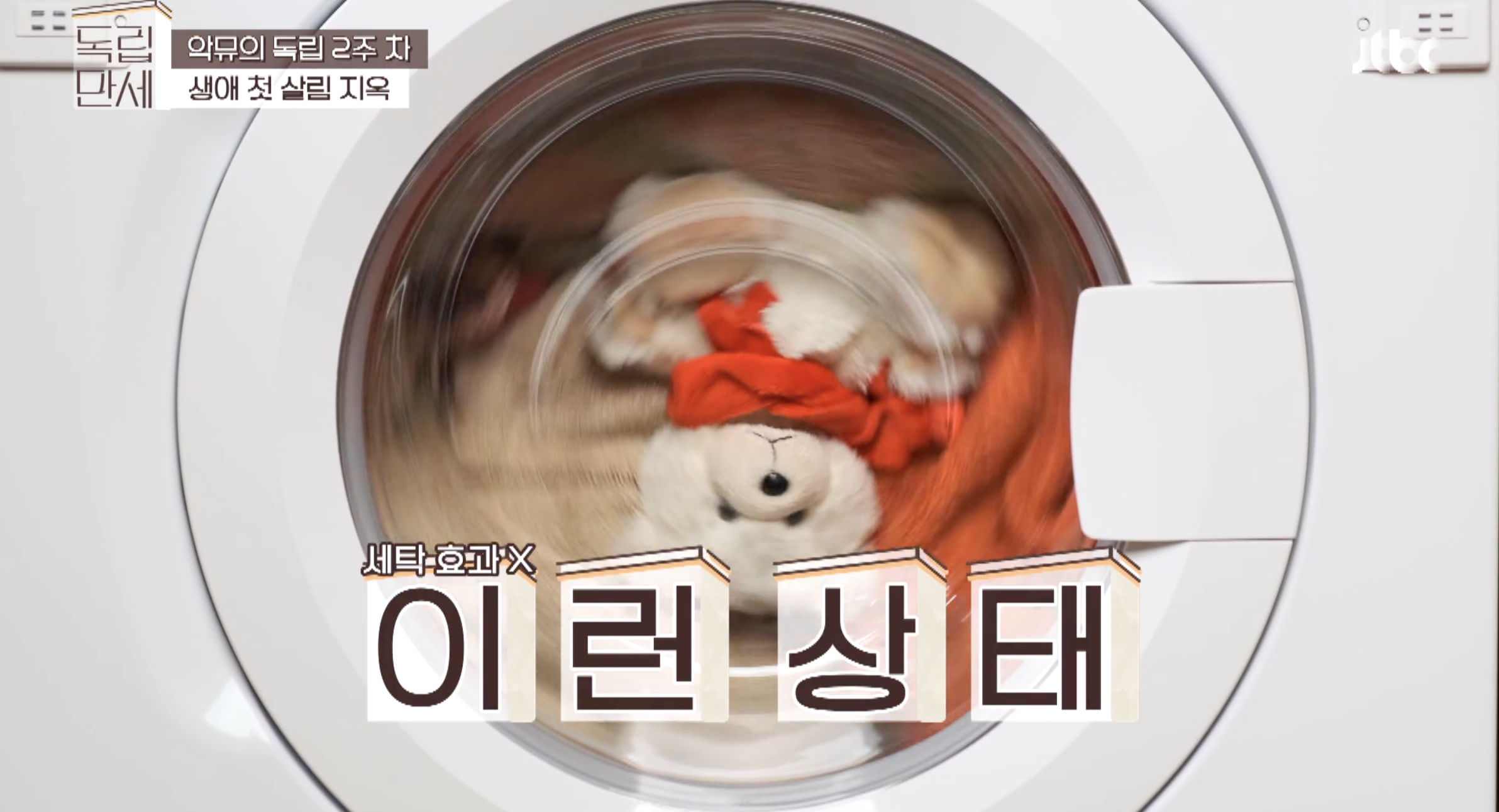아무튼, 첫번째 빨래를 끝내고 이어서 곰돌이 인형을 세탁기에 구겨 넣어 세탁을 시도하는 수현! 세탁기에 구겨들어가는 곰돌이를 보며 스튜디오 안은 탄식으로 가득찼는데요. 곰돌이 인형이 워낙 커서 세탁 효과가 없는 걸 알고 있기 때문에 아마 이런 탄식이 나오지 않았을까 해요.