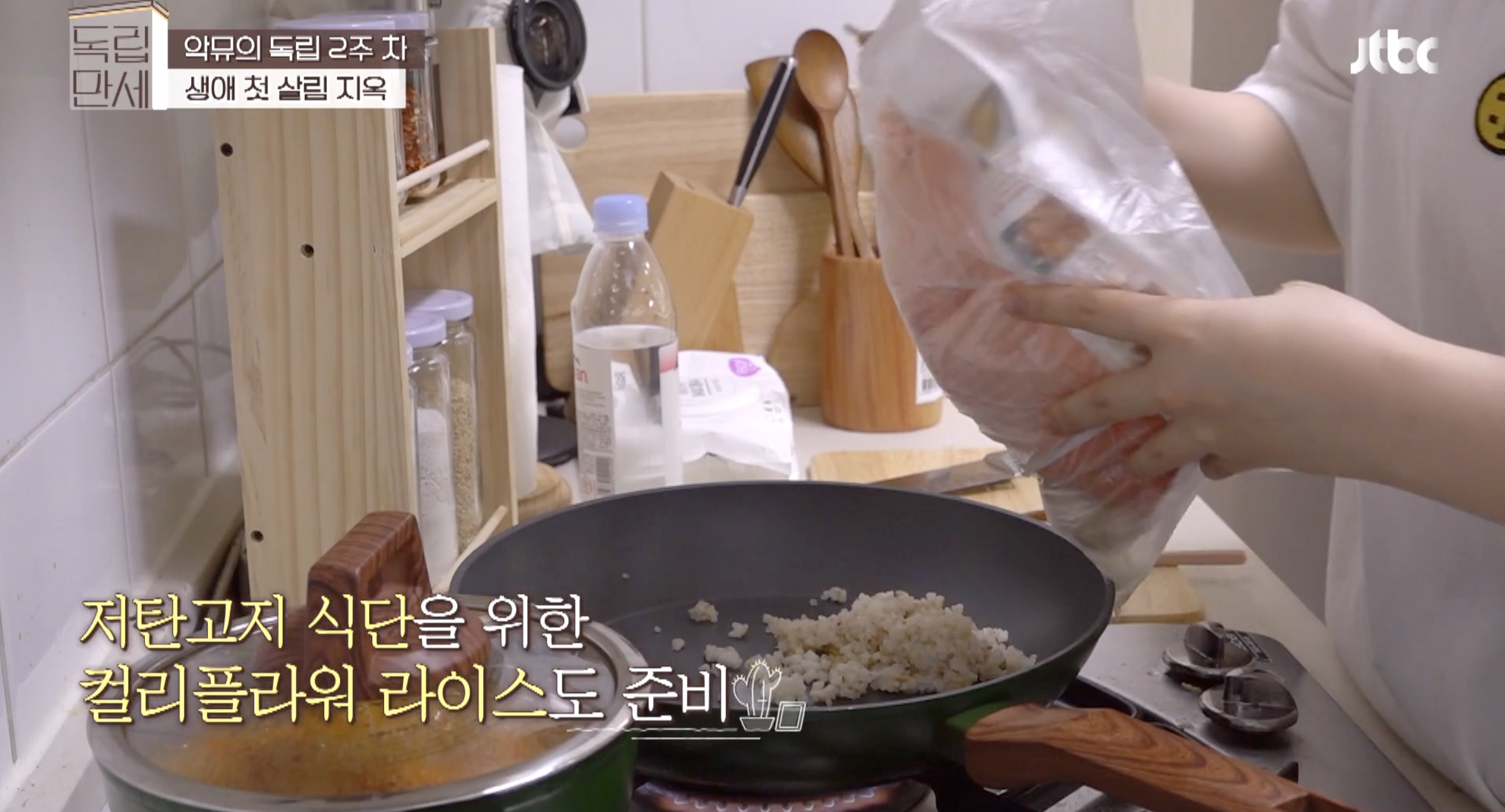 저탄고지 식단을 유지하는 엄정화씨도 얼마전 온앤오프에서 아침식단을 공개하면서 컬리플라워 라이스로 김치볶음밥을 만들어 먹는 장면이 나왔었는데요. 수현 역시 컬리플라워라이스로 볶음밥을 만들어 먹더라구요.