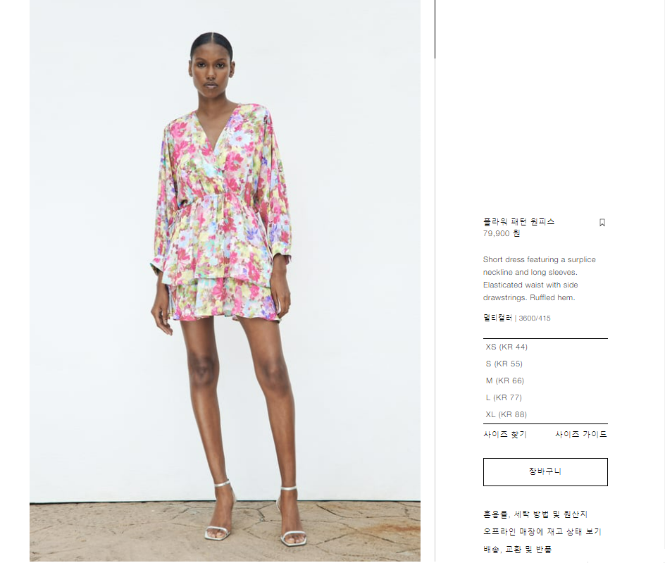 먼저, 유럽풍 디자인이 특징이며, 사이즈가 매우 다양한 자라(ZARA) 입니다. 자라(ZARA)에서 추천하는 원피스는 '플라워 패턴 원피스'입니다. 이 원피스는 허리에 밴딩이 있어 허리라인을 잘 잡아주고, A라인 스커트가 있어서 하체를 커버해줍니다. 또한 화사한 꽃무늬 패턴이 여름 분위기를 더해줍니다. ZARA의 플라워 패턴 원피스는 공식 홈페이나 온프라인 매장에서 구매할 수 있습니다. (가격은 79,900원)