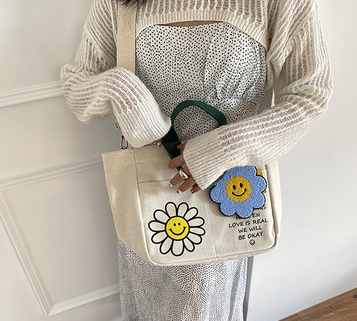 데이지 캔버스 에코백은 데일리한 느낌으로 여름철 코디하기 좋은 아이템입니다. 튼튼한 캔버스 소재로 제작되어 유연하고 내구성이 우수한 제품입니다. 전면의 포켓 디자인이 에코백의 포인트를 살려줍니다. 그리고, 내부 수납공간도 넉넉해 텀블러, 파우치 등을 수납하기고 유용합니다. 컬러는 그린, 레드, 블루 세 가지 색상이 있으며 다양한 키링 연출로 포인트를 더 살릴 수 있습니다.